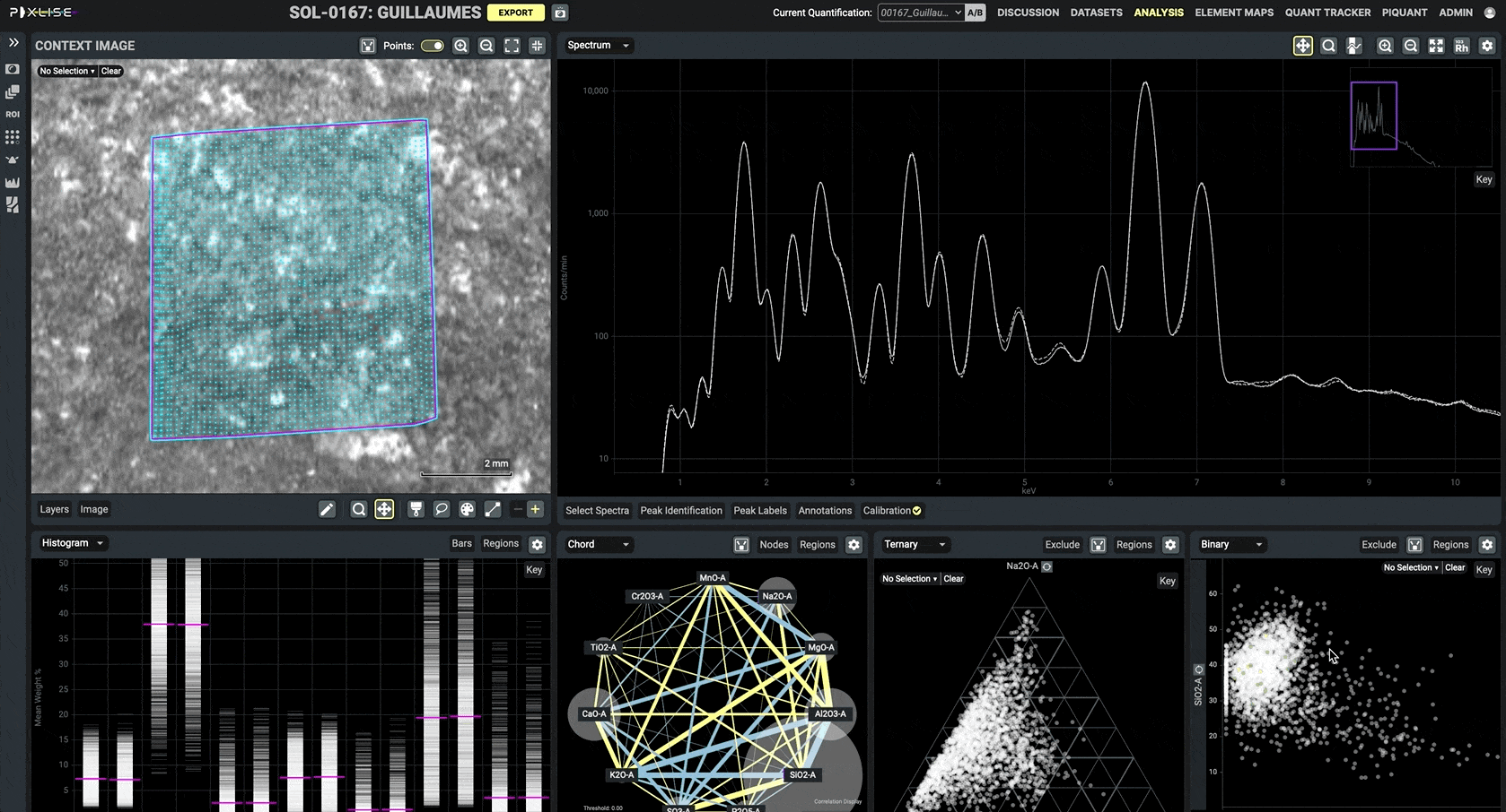 Every view in PIXLISE responds to input into any other view instantly, allowing the scientist to investigate recognize patterns in multiple dimensions. Selecting a scan point in based on geospatial location automatically shows its spectra, elemental composition, and relative distribution. Alternatively, a geoscientist could select for points that have a high concentration of a single element, and immediately have those scans selected in the geospatial view. One of PIXLISE’s foundational principles is that every view should be alive, responsive, and interconnected.