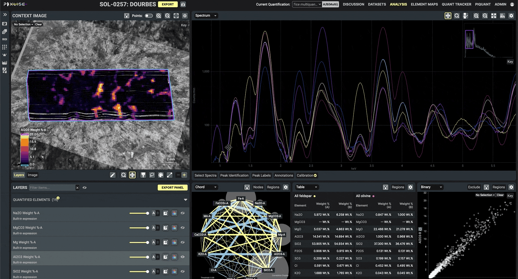 PIXLISE is an interface informed by thousands of hours of collaboration between geoscientists, visualization designers, UI engineers, and big data cloud computing innovators. With intricately-connected features, colorblind-safe palettes, and customizable plot panels, PIXLISE’s flexible user interface empowers the modern scientist with an innovative workflow, allowing for groundbreaking insights and discoveries.